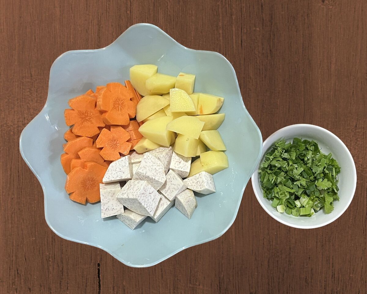 - 豚足が柔らかくなったら、先にニンジンを入れ、5分ほど煮込みます。 その後、ジャガイモ、紫芋、蓮の実を加え、10分ほど煮込み続けます。