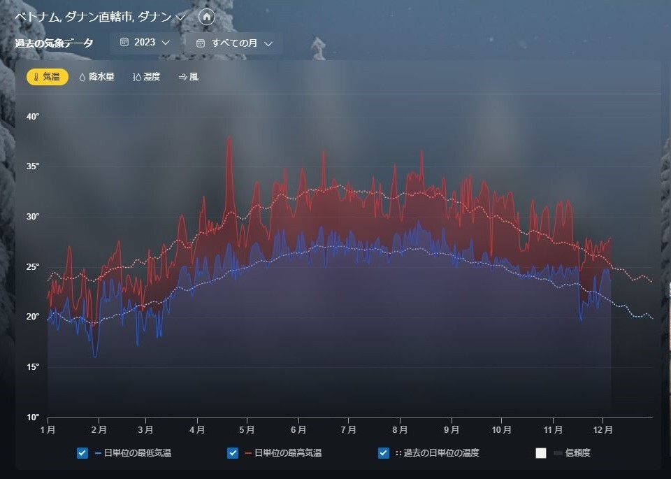 ダナンは主に「乾季」と「雨季」の2つの時期を持ち合わせており、乾季は晴れていてほぼ雨は降らない気候、雨季は曇り空と雨が多くて気温も下がる時期となっています。
