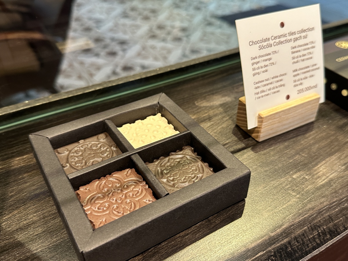 板チョコレート、ボンボンチョコレート、カシュ―ナッツチョコレートなど、板チョコレートは59,000VNDから、4つ入りのボンボンチョコレートは195,00VNDからお買い求めいただけます。