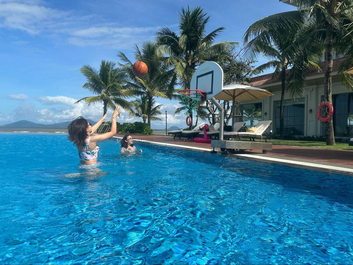 プール脇にはビーチベッド、プール内にはバスケットゴールなどもあり、プールエリアではのんびり遊ぶことができます。