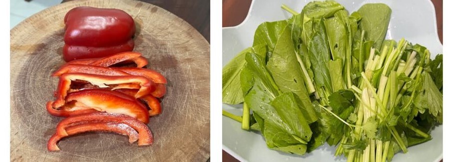 - 下処理として、海老とイカの生臭さを消すために、洗った後、薄めた塩水に1〜2分ほどつけておきます。その後、エビは背ワタ、イカは目と墨袋を取り除き、再度洗います。野菜のパプリカはワタをとり細切りに、セロリと小松菜は長さ約5cmに切ります。