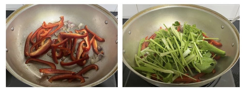 - 熱したフライパンに食用油大さじ3を加え、紫玉ねぎのみじん切りを入れたら、中火で15秒ほど炒めます。パプリカ、小松菜とセロリの芯も加えて2分ぐらい炒めます。すべてしんなりしたら、イカ・エビ・小松菜・セロリの葉に、醤油小さじ1/2、味の素粉小さじ1を加えて更に1分〜2分間炒めます。
