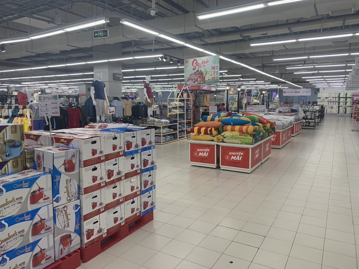 ベトナム全土に展開する韓国系スーパーロッテマートはスーパーの他にファストフード店、薬局、映画館、カフェ、お土産屋さん、衣料品店、などを完備した5階建ての複合施設になっています。