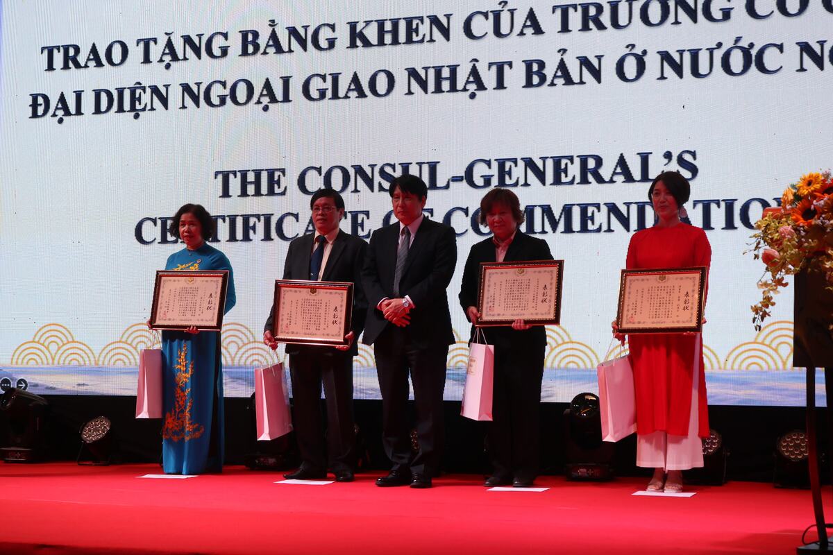 在外公館長表彰では、トゥアティエン・フエ省市各国友好協会連合会、トゥアティエン・フエ省越日友好協会、公益財団法人国際開発救援財団(FIDR)ベトナム事務所、漆画家 安藤彩英子氏が表彰を受けました。