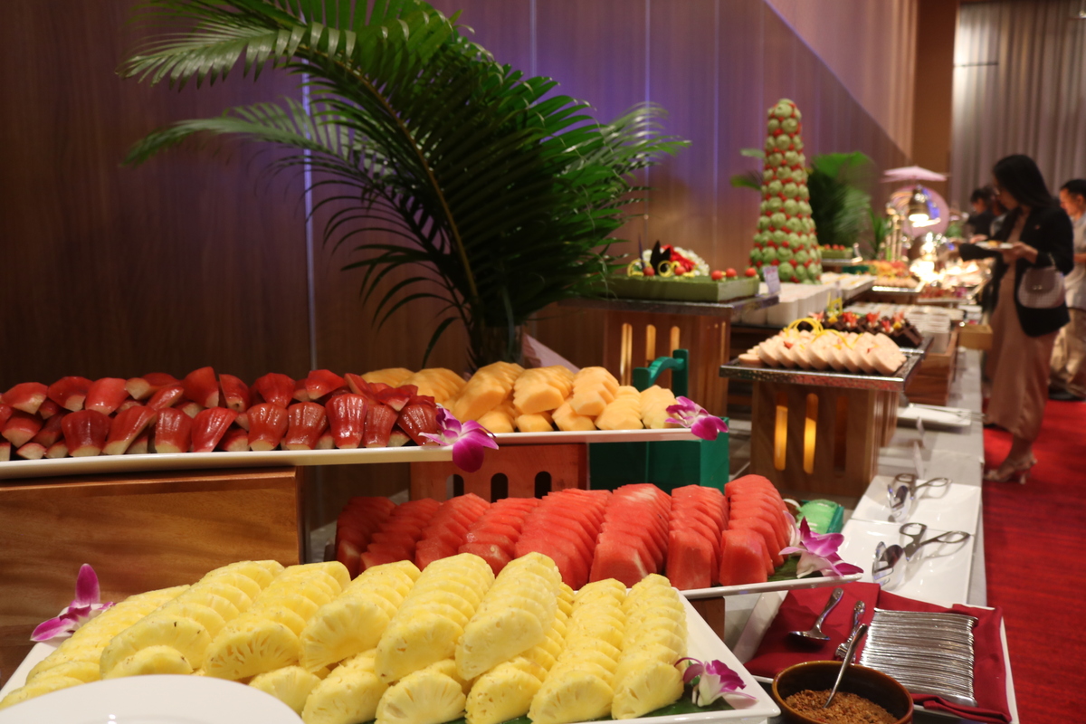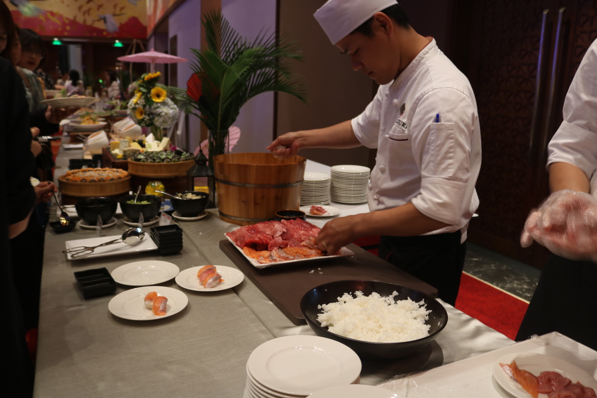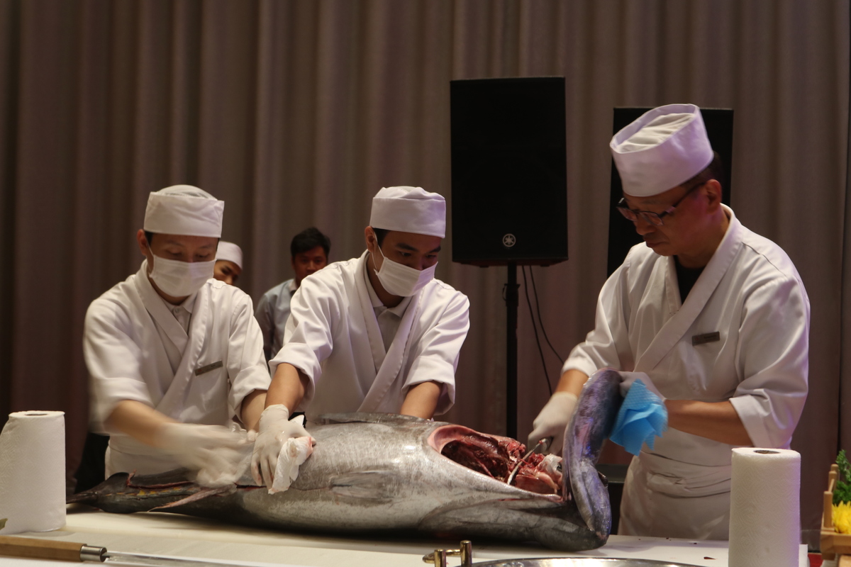 会場では、三日月の日本人料理長が日本から直輸入されたマグロの解体ショーの実演を行ったほか、寿司、蕎麦、その他日本食料理やデザートが立食形式で豪華な料理が振舞われました。