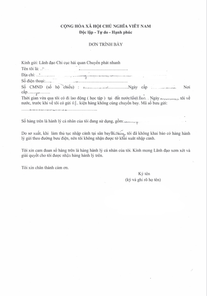 名前、国籍、旅券番号、旅券の期限、ベトナムでの住所、荷物の内容の詳細を記入します。書類はすべてベトナム語ですしベトナム語で記載しなければならないので、やはりベトナム人に手伝ってもらわなければ厳しいです。