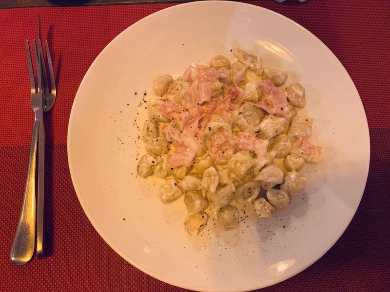 伸ばしたパスタ生地の中には牛肉と豚ひき肉が包まれており、ソースはハムとチーズと生クリームで絶対に美味しい味!そしてリング状になっているため食感も楽しめます。
