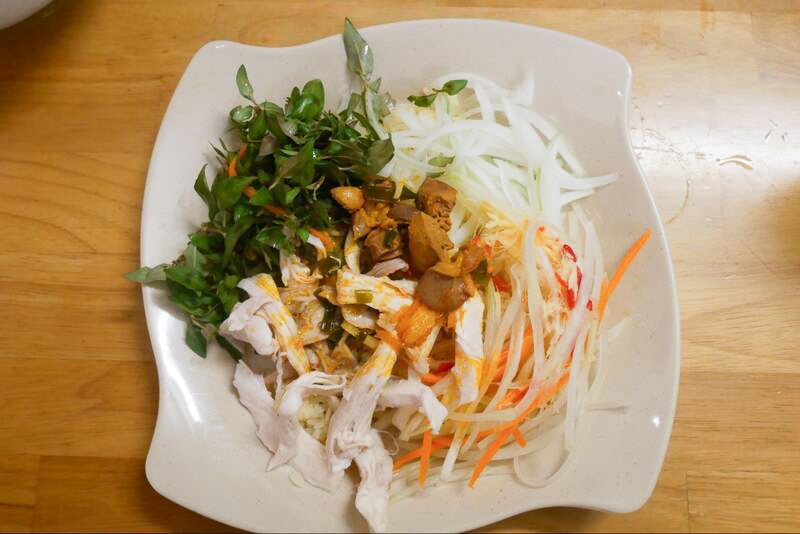 ホイアンのコムガーは茹でた鶏の身と鶏の出汁で炊いたご飯を一緒に頂く料理です。