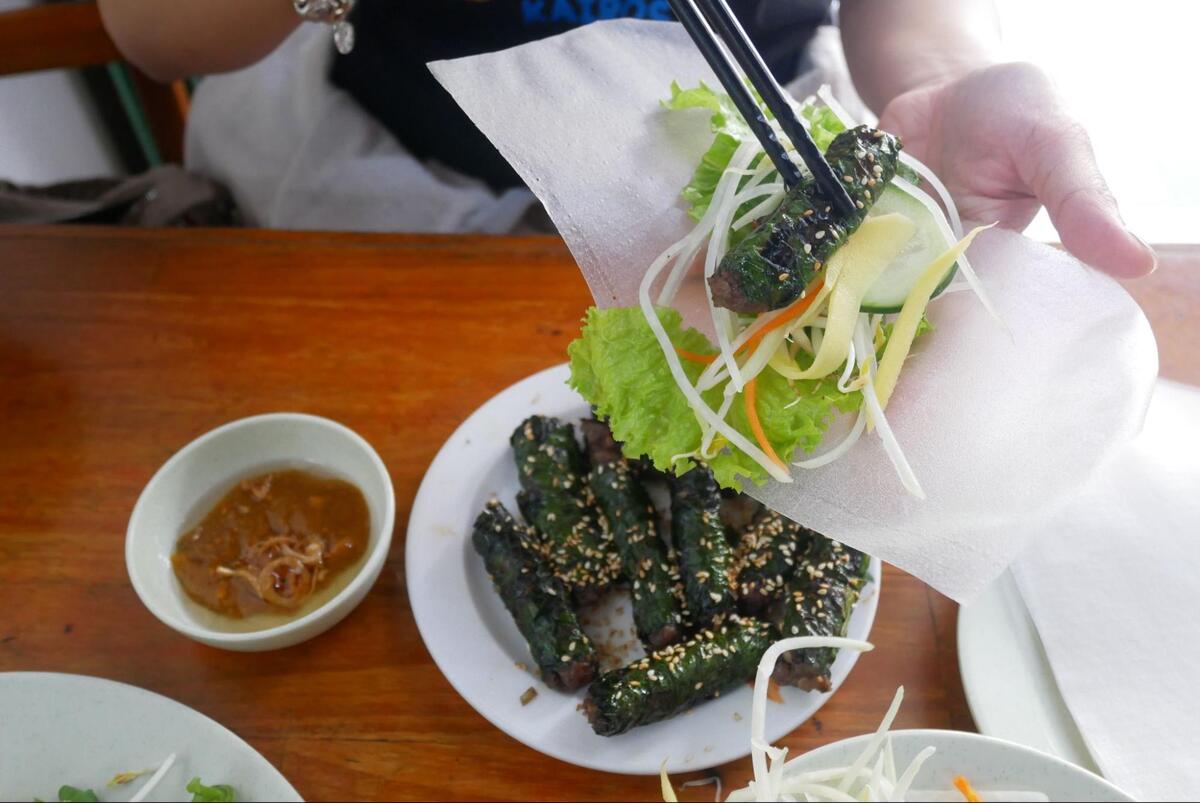 ライスペーパーで生野菜や漬け物と一緒に巻き、甘辛いタレにつけて食べるのが定番です。