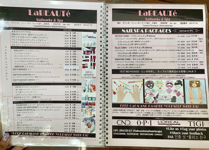 ダナンでは日本語メニューがきちんとあるネイルのお店はまだ少ないのでおすすめです。