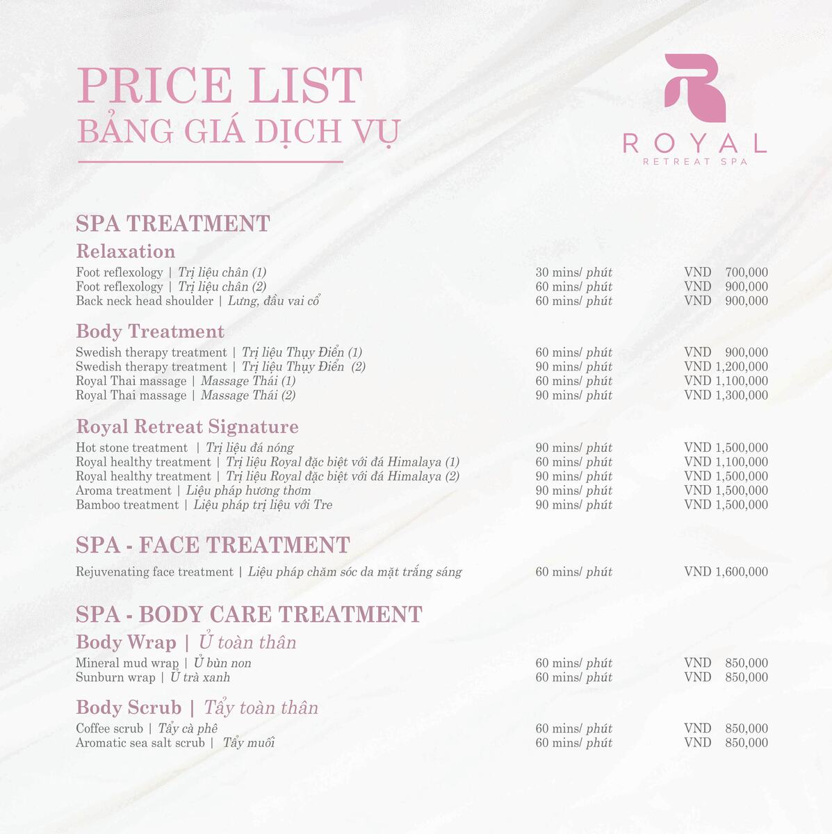 ROYAL RETREAT SPAのメニュー