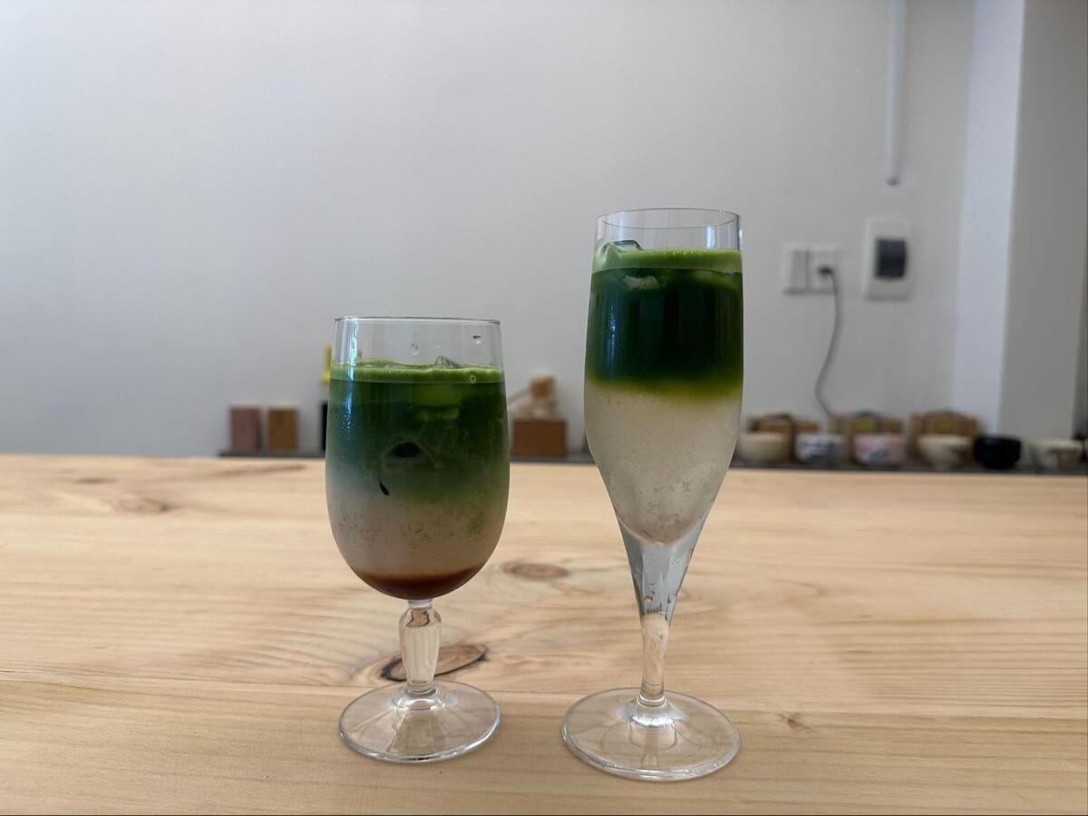 薄茶や若者に人気の抹茶ラテ、そして少しアレンジされた抹茶とコンブチャのミックス、抹茶とココナッツフラワーシロップのミックス等のドリンクが展開されています。