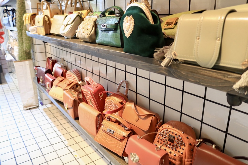 色別に分かれているバッグ。ベトナムでは小さいバッグが主流なのでこのサイズのバッグが多くセレクトされています。