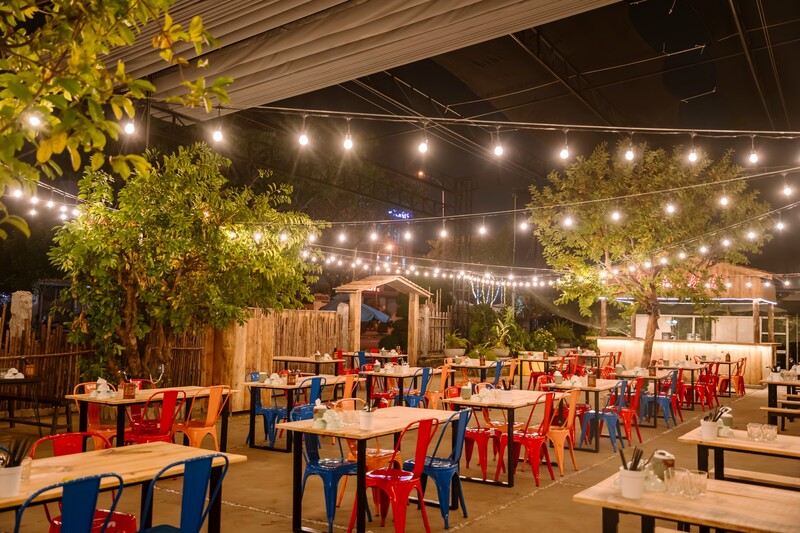 小道沿いに佇む開放的な店内では、豚肉や牛肉、シーフード、野菜などの多彩な焼き物をはじめ、トムヤム鍋やキムチ鍋、サラダ、おつまみなど豊富なメニューを楽しめます。