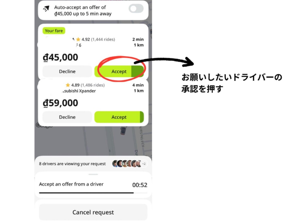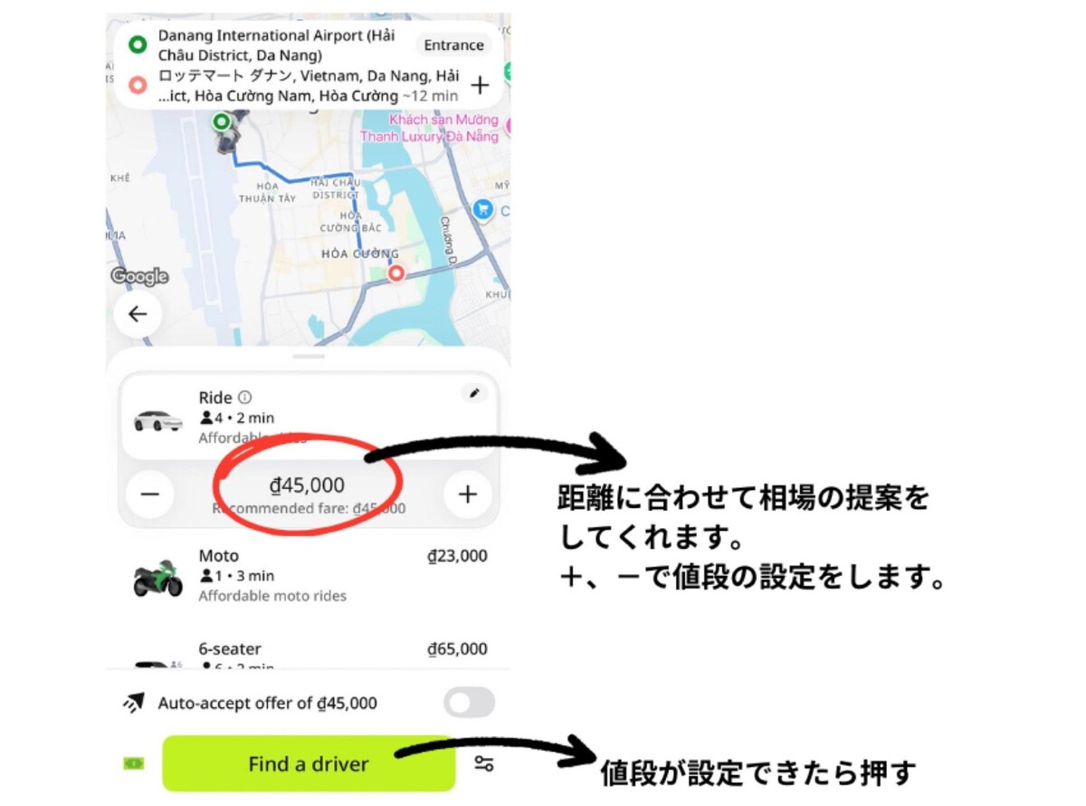 ・料金を設定して交渉する仕組みのため、Grabなどのアプリと比べると、配車確定までに時間がかかる場合があります。