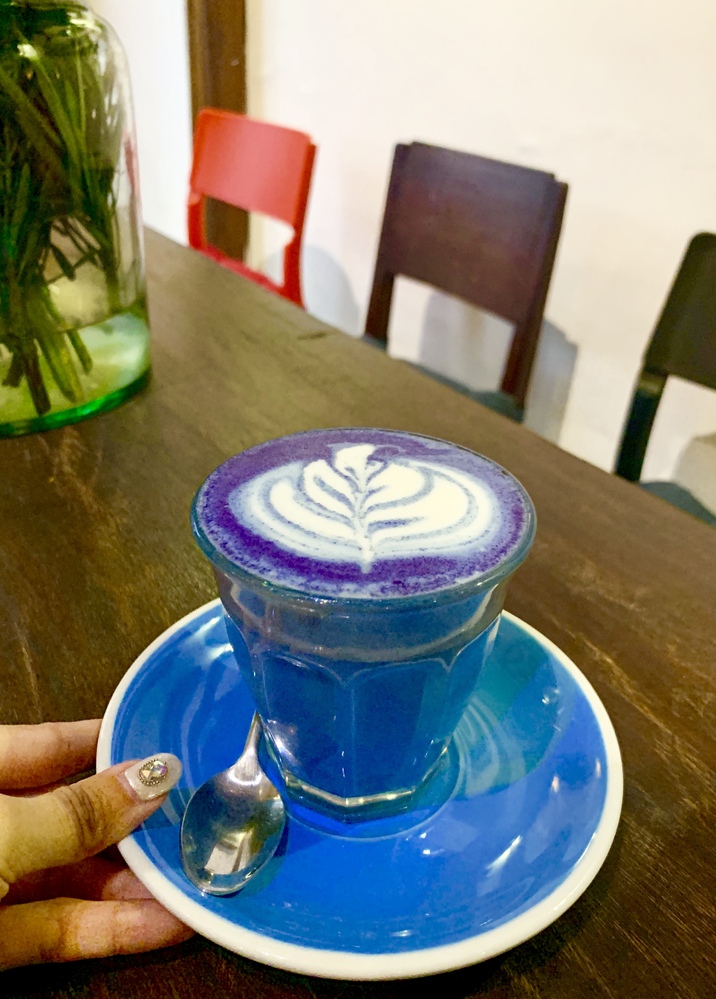 ブルーラテ:スチームミルク・バタフライピー(認知症予防)・カフェインなし