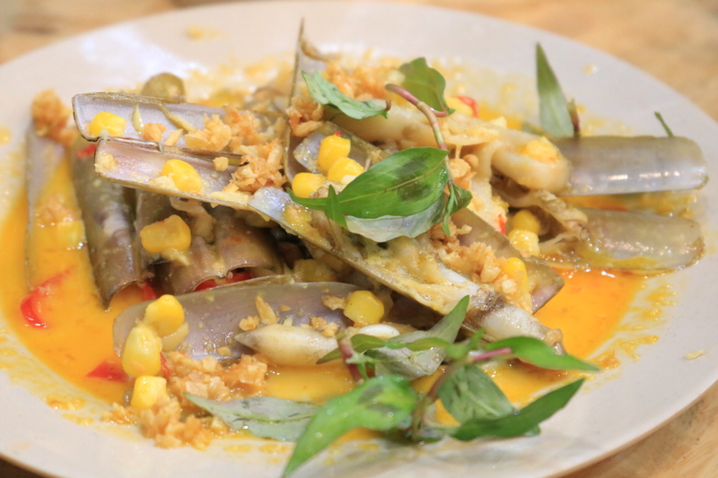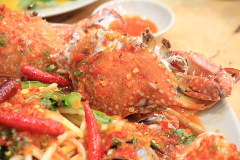カニ2匹、シャコ2尾、貝類が数種類、辛いパパイヤサラダがついてきました。