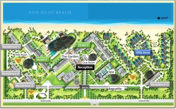 ホテルから五行山(マーブルマウンテン)まで車で3分、ダナン市内のドラゴンブリッジまで車で15分以内、最寄りのダナン国際空港まで車で20分、30分です。