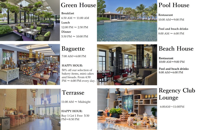 - 6つのお食事処 全宿泊者様が利用できるレストラン、バー、パン屋は合わせて5つ用意されています。 Green House、Pool House、Beach House、Terrasse、Baguetteになります。 メインがGreen Houseレストランで、こちらで朝食ビュッフェが行われます。ベトナム料理のフォーからフレッシュフルーツジュース、自家製パンが人気です。 もう一つは特定のお客様が利用できるクラブルーム。該当のお客様はこちらでご朝食を頂けます。(詳細は以下に記載) ルームサービスも行われているので、もしホテルから出ない場合でも食事に困ることはありません。