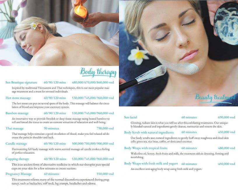 - ボディーセラピー各種(シグネチャー/ホットストーン/キャンドル/カップ/タイ/妊娠中のマッサージ) 時間:60分~120分 値段:480,000VND~960,000VND:約2900円~5900円