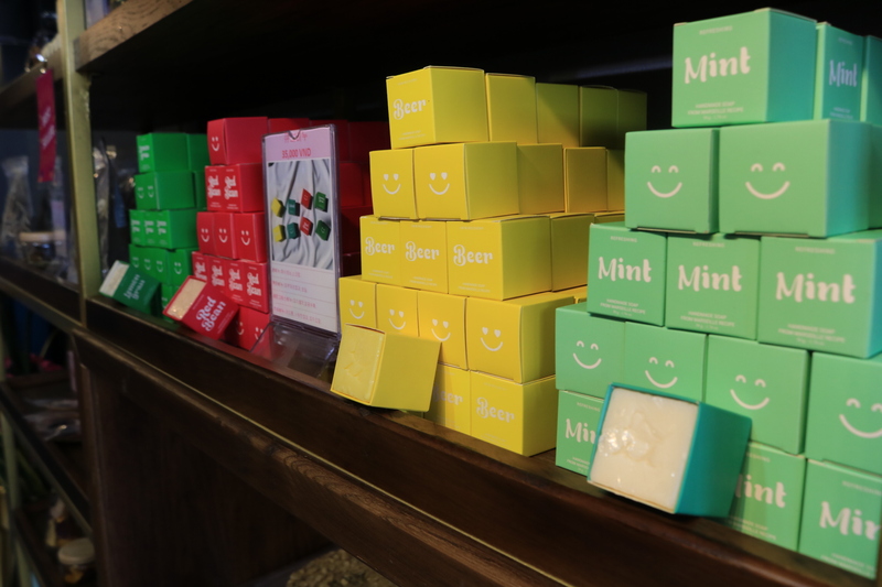 ミニ石鹸はレモングラス、小豆、ビール、ミントの4種類の展開。