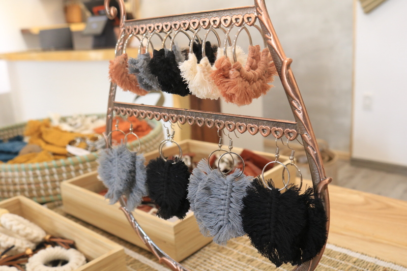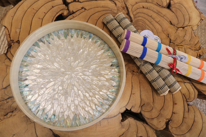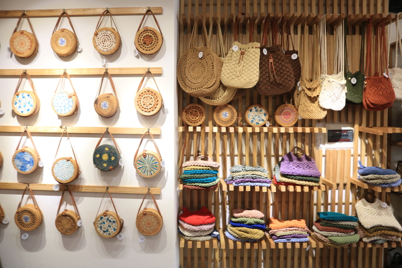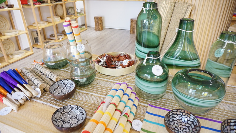 ランチョンマット、ココナッツのボウル、お盆、花瓶、籐(トウ)でできた敷物、アクセサリーなど見ていて楽しい商品が並びます。
