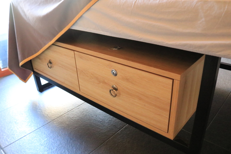 鍵付きの荷物入れがベッドの下にあり、貴重品はこの中に入れましょう。