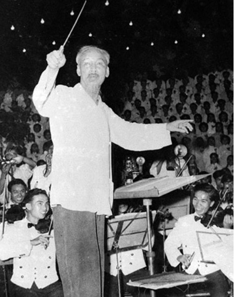 ベトナム共和国の創立15周年9月19日の夜:ハノイ植物園でのベトナム労働者党の第3回議会を祝うために「Kết đoàn」の曲で指揮を執るHo Chi Minhさん