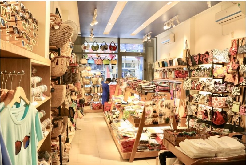 ワンピースや竹のバッグ、刺繍のバッグ、バッチャン焼き、チョコレート、お茶、ドライフルーツ、アクセサリーなどが目白押し。