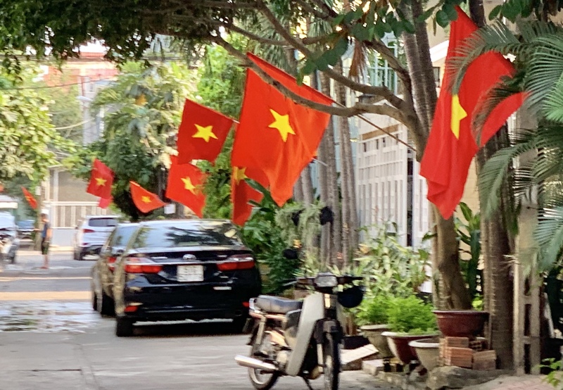 祝日、もしくは祭日になると町にベトナム国旗がたくさん立てかけられる様子を見ることができます。