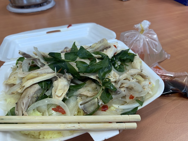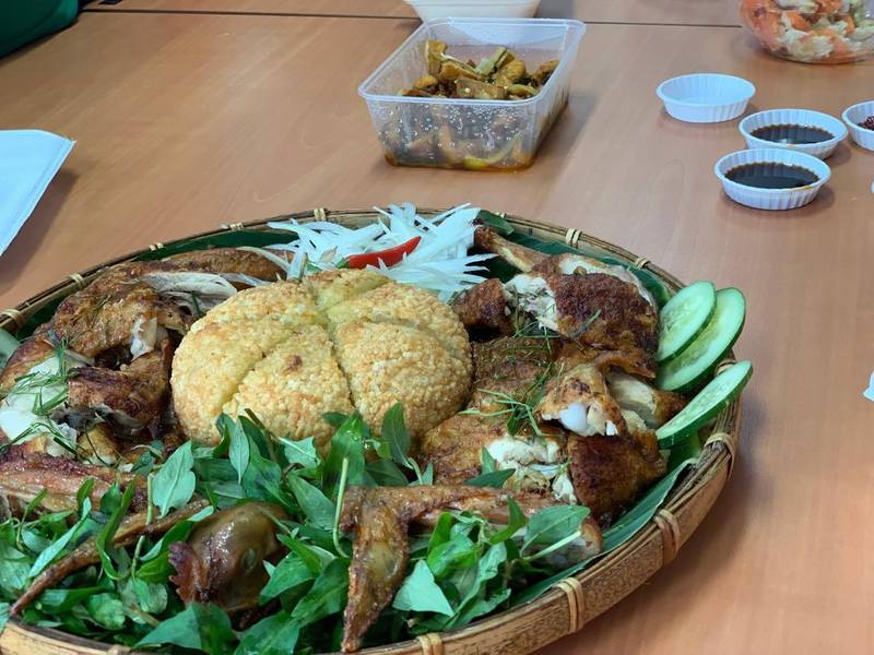 ターメリックで色付けされたご飯と蒸した鶏肉がのっているベトナム中部の料理。