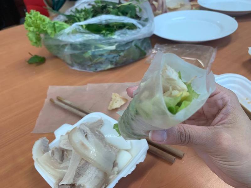 ベトナムの中部の名物の豚巻き。蒸した豚と生野菜を2種類のライスペーパーで巻いてタレに付けて頂く料理。