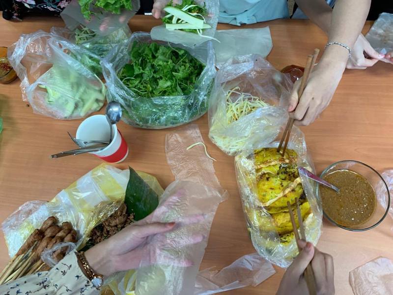 バインセオと野菜をライスペーパーに包んでタレに付けて頂く料理です。