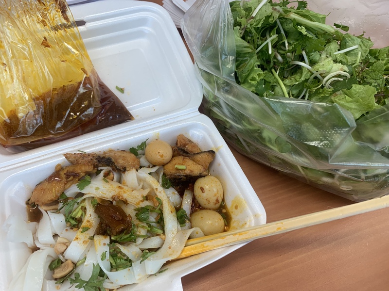 ベトナム中部ののっぺりした米粉の麺、ミークアン。野菜と一緒に頂きます。