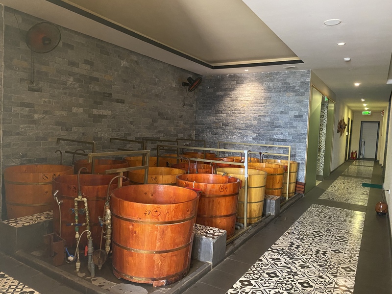 お湯は茶色押しており木屑や葉っぱなどで煮だしたDao族伝統のハーブ風呂となっています。