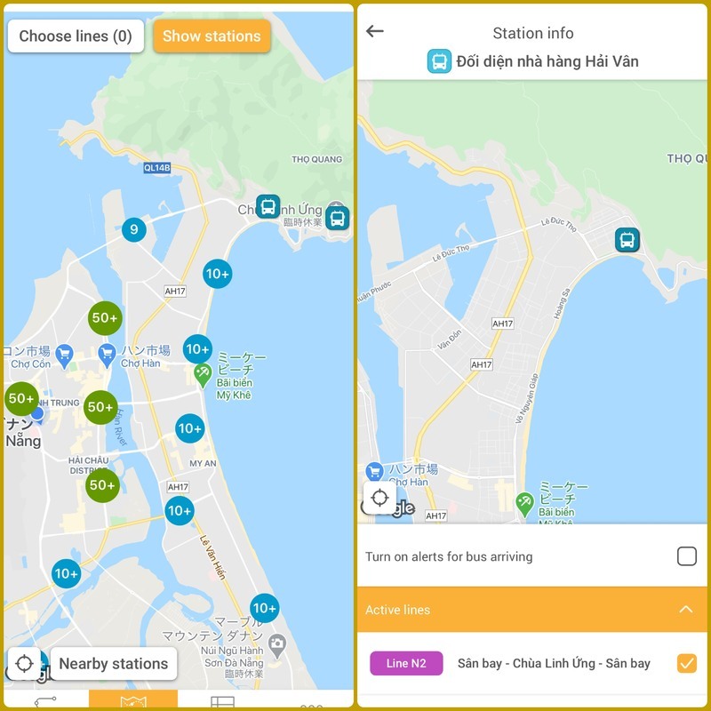 ダナン市が運営する公式アプリでは「路線」と「バス停」を押すと、「〇分後にバスがきます。」という表示が出るので、目安として確認しましょう。