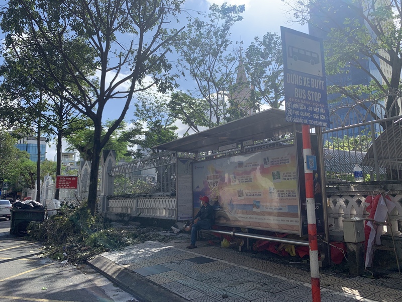 ダナン市のバス停は、バス亭の青の看板が立っている、のが目印となります。