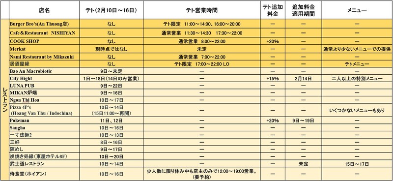 今回はダナンの「テト期間飲食店情報」をまとめてご紹介いたします。