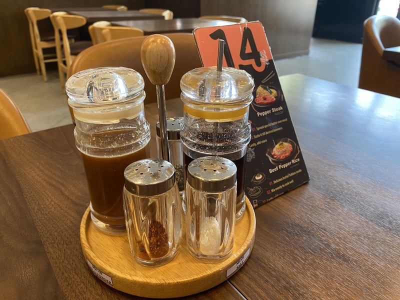 卓上の調味料は合計4つ。ニンニク入りのステーキソース、ちょっぴり甘めのハニーブラウンソース、胡椒、塩、でお好みに合わせて追加しましょう。