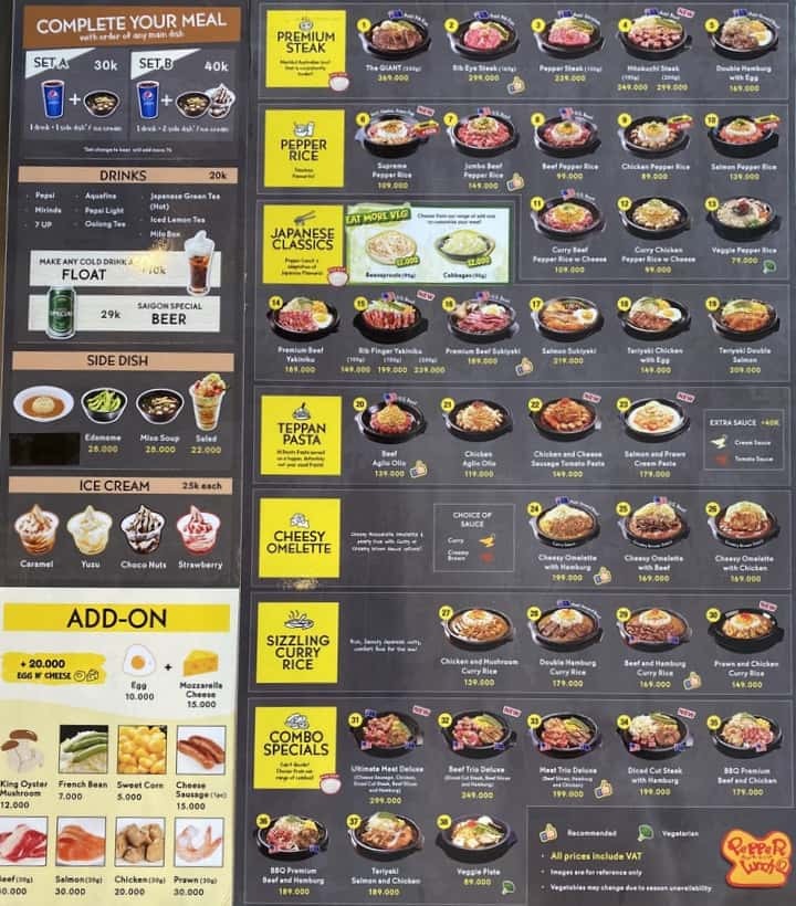 定番のビーフペッパーライスは99.000VND(約500円)、ハンバーグカレーライスは169.000VND(約850円)で提供しています。