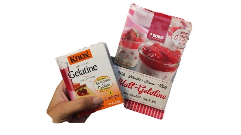 輸入物を取り扱うミニスーパーやコンビニでは、写真のようなゼラチン粉とゼラチン板を入手することが可能です。