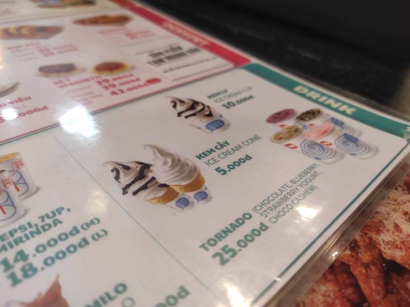 プレーンは5.000VND(25円)、チョコレートは7.000VND(35円)です。ソフトクリームよりも大きなサイズのサンデーは15.000VND(約75円)で販売しており、そちらはマンゴーあじなど限定メニューも多いので要チェックです。