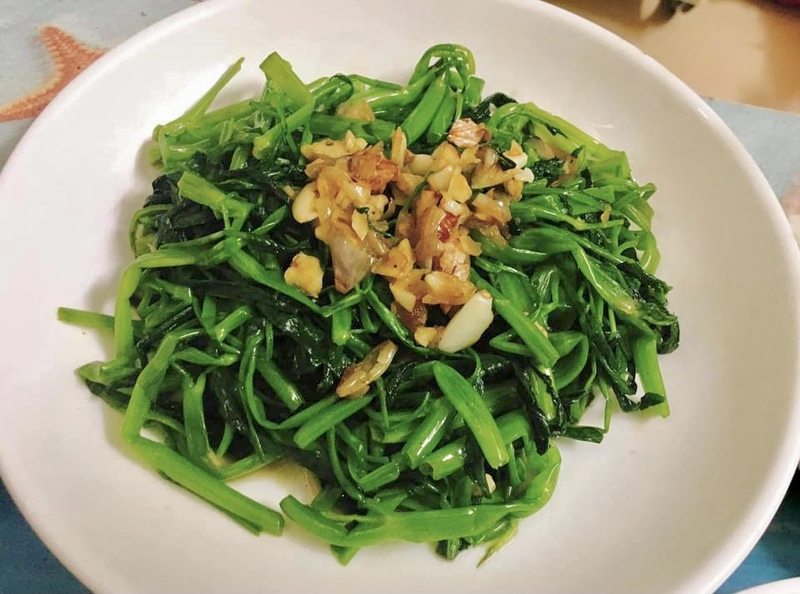 空心菜とにんにくを油で炒め、塩、こしょうなどで味付けて、たっぷりのニンニクが香り高く美味しい!