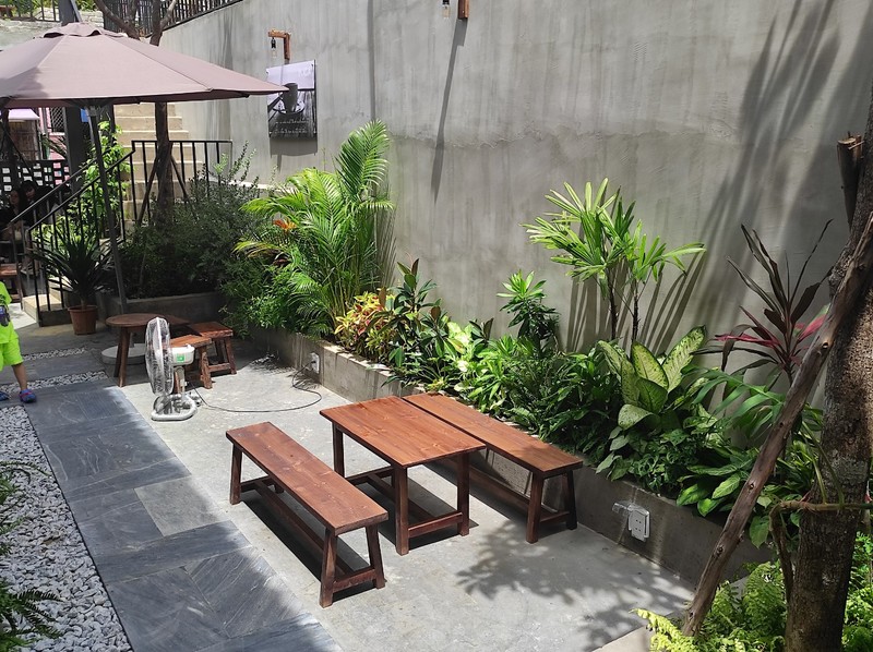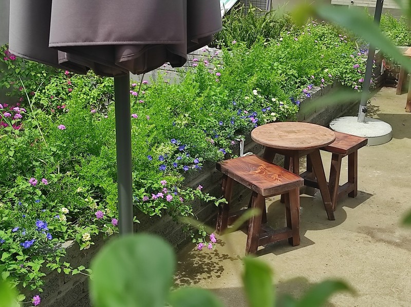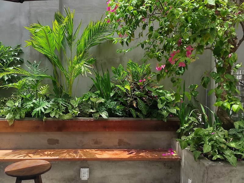 カフェスペースはコンクリートの打ちっぱなしと砂利の灰色がメインですが、ブーケンビリアなどの木やシダ植物、小花などの大小さまざまの多種類の植物が植えられています。
