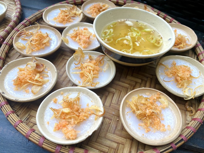 バインベオ(Bánh bèo)はベトナム中部のフエの名物料理であり、水で混ぜて溶いた米粉とタピオカ粉の生地を小皿に入れて蒸し、海老のすり身と揚げた豚皮やネギをのせ、ヌックマムのタレをかけて食べる料理です。