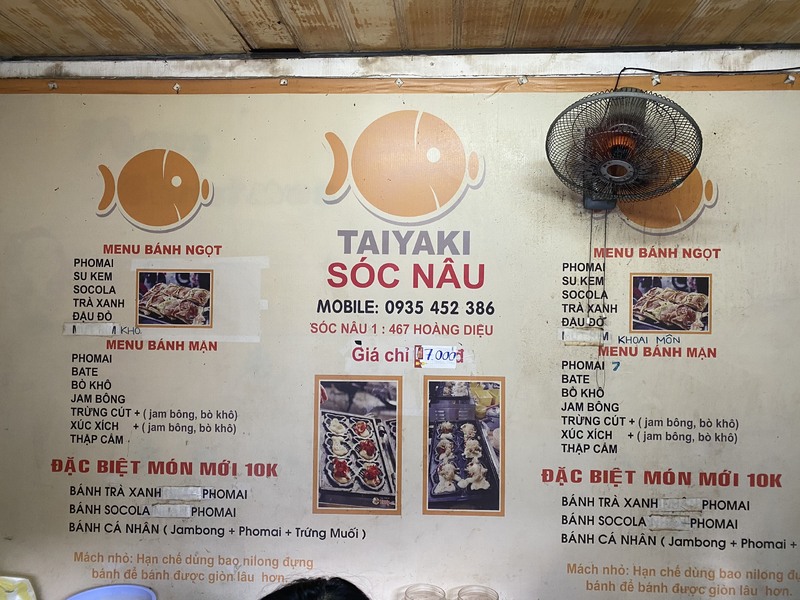 ベトナムで一般的なタイ焼きのメニュー「あんこ:Đậu đỏ」「抹茶:Trà xanh」「チョコレート:Sô cô la」「チーズ:Phô mai」「ミックス:Thập cẩm」の5種類が販売されています。