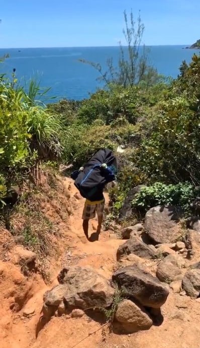 整備された道路から途中で小道に入り、細い岩場を通って下に降り、遠くに見える入り江に向かってさらに歩きビーチに到着します。