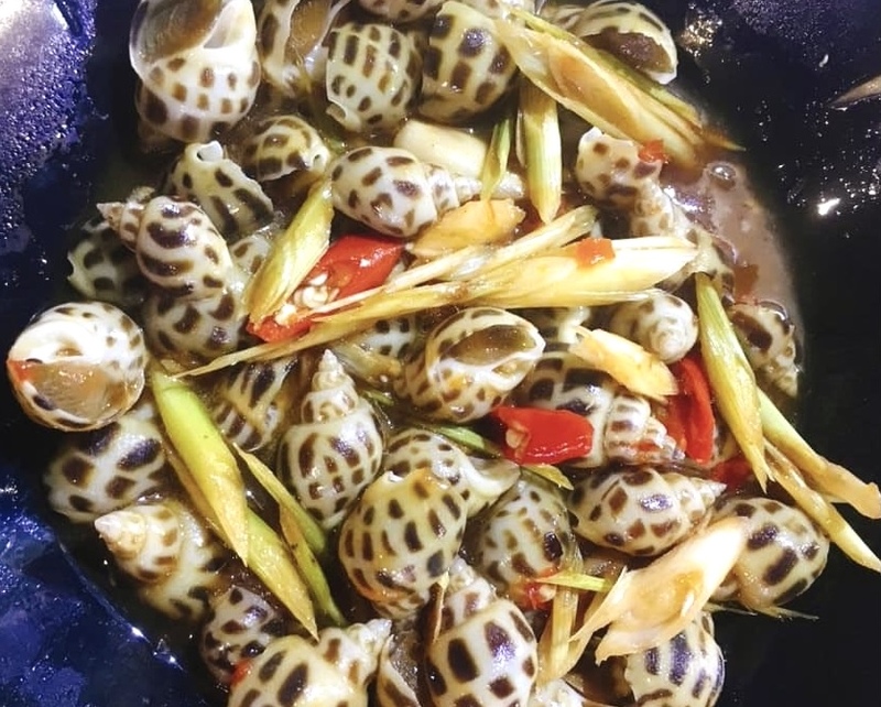 薄切りレモングラスと唐辛子を油で炒めた後に、茹でた巻貝を鍋に入れ、調味料を入れたら出来上がります。