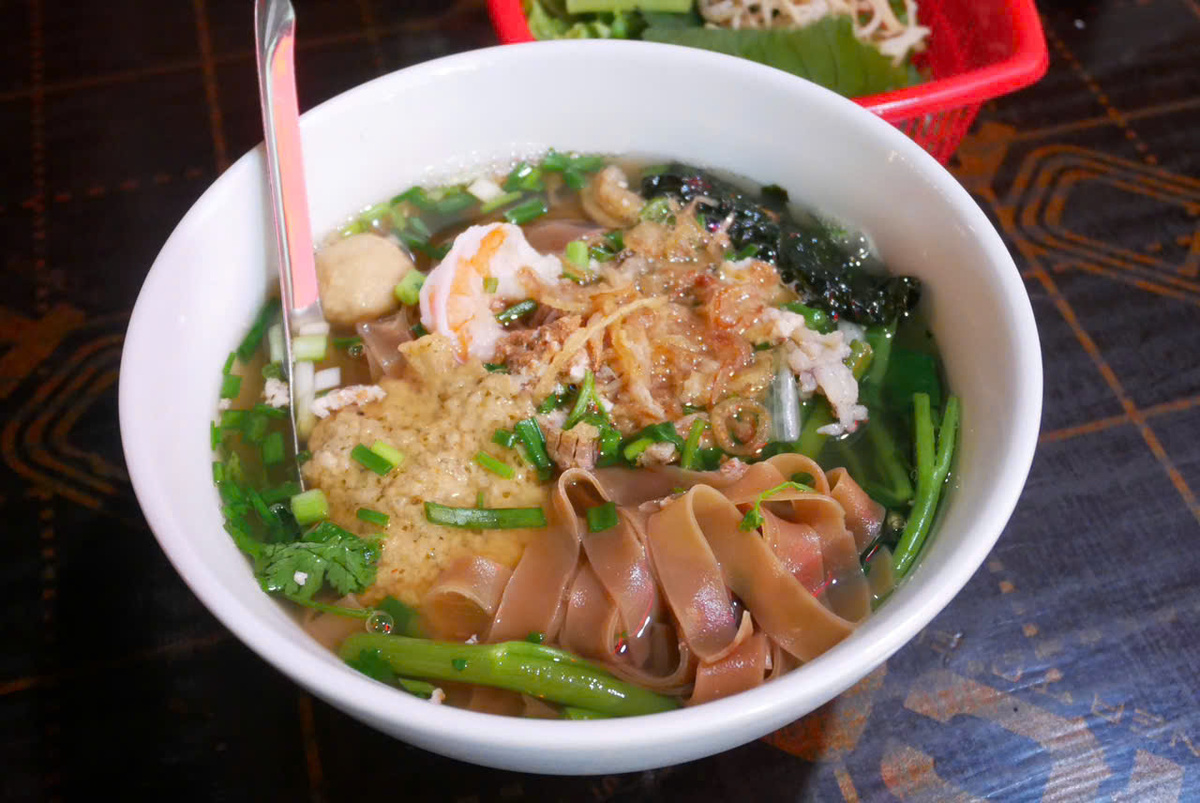 まるでフィットチーネのような見た目で、弾力があり食べ応えもある麺は、ハイフォン名物。