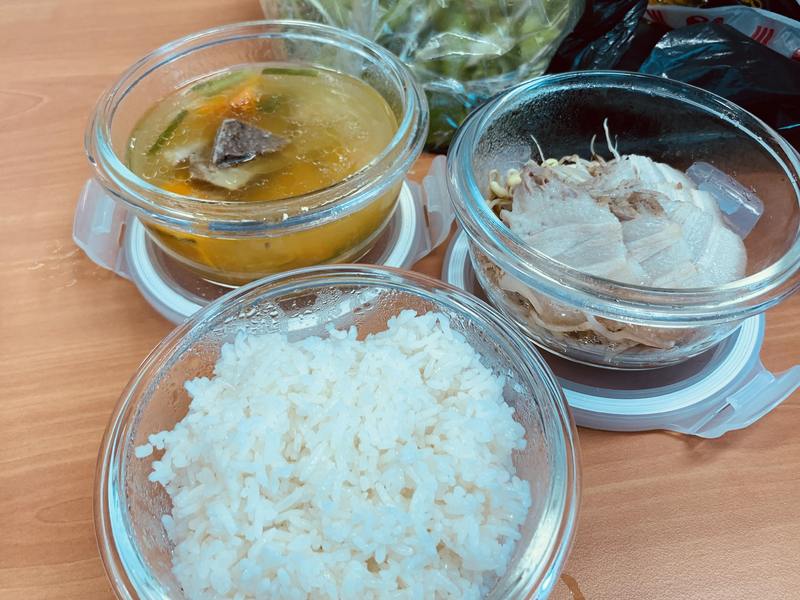 野菜とお肉のスープ・豚肉ともやしを蒸したもの(ヌクマム付き)・白米のお弁当。